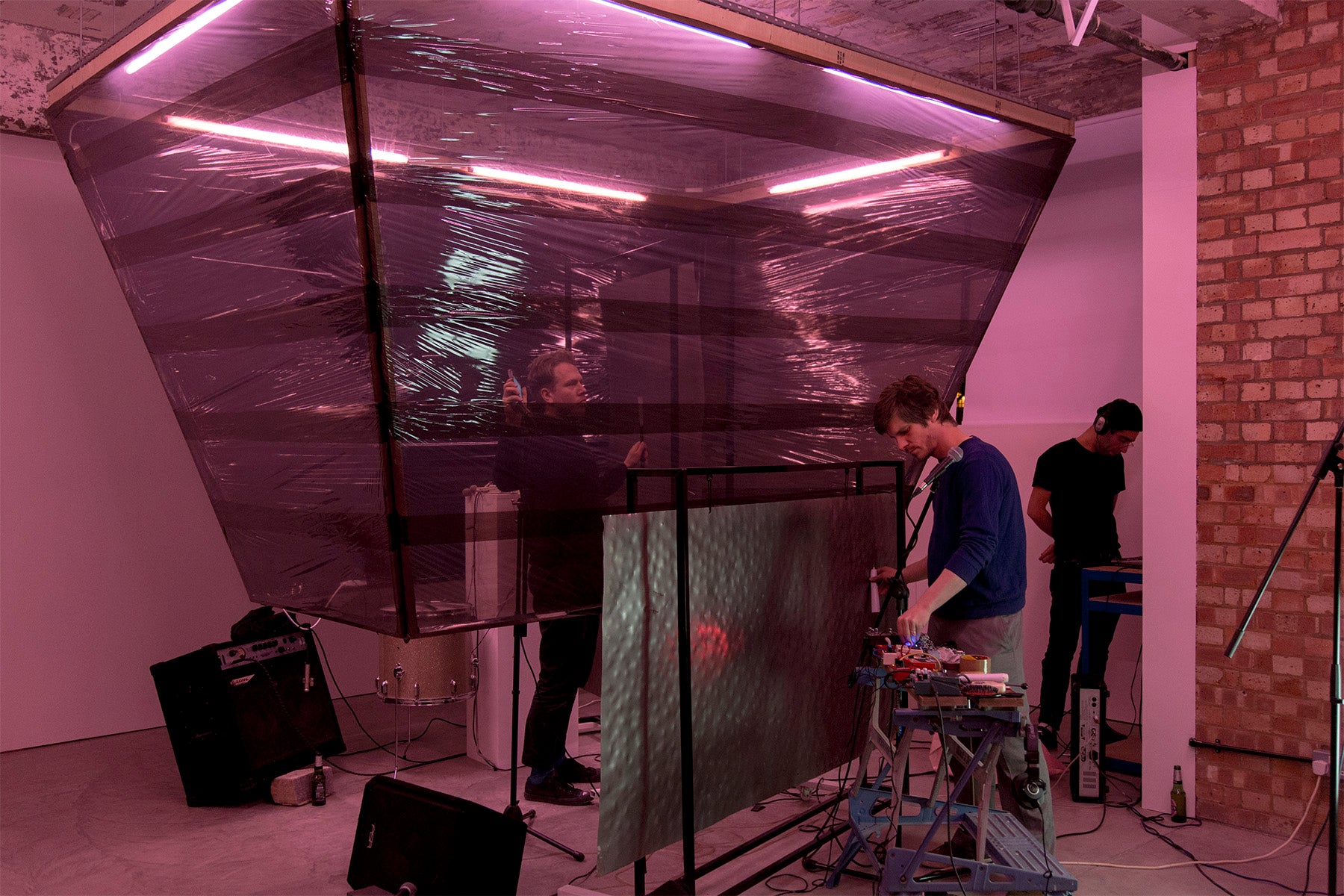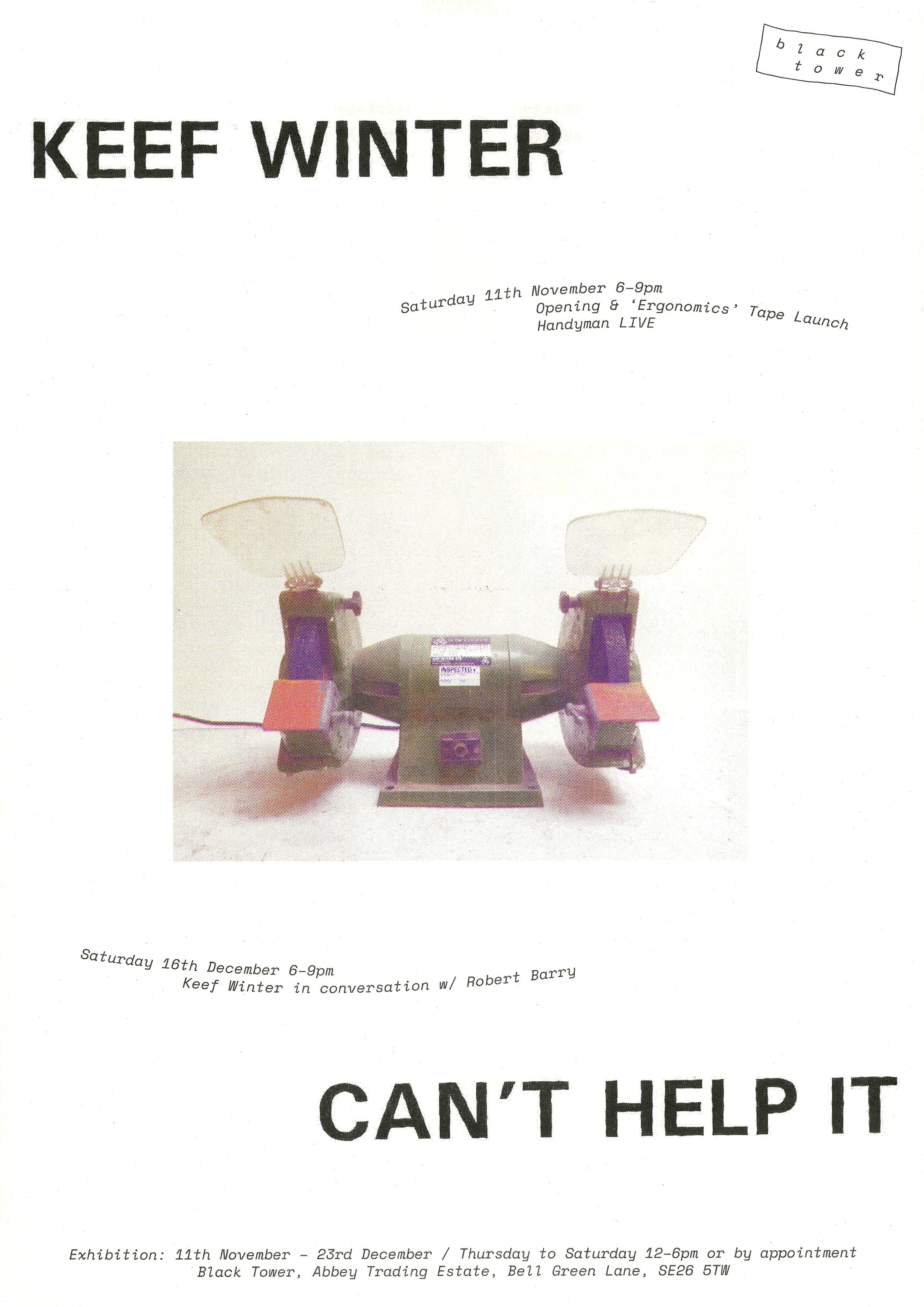 Launching at the opening of the exhibition, Winter has produced Ergonomics, a cassette of new work that takes an approach to producing music as a sculptor would carve an object. The record begins and ends with a hung sheet of steel used as a reverb plate, conducting sound in a cyclical fashion, a meditation on what this material can afford the listener. Taking cues from his everyday vernacular; his studio and the surroundings of Black Tower Projects, Winter mixes found sounds of neighbouring workers, distant hums of helicopters flying overhead and the noise of his fridge purring at night. Contributions from a range of collaborators are peppered throughout, enriching the project with a dynamism that remains within the orbit of the sheet of steel.