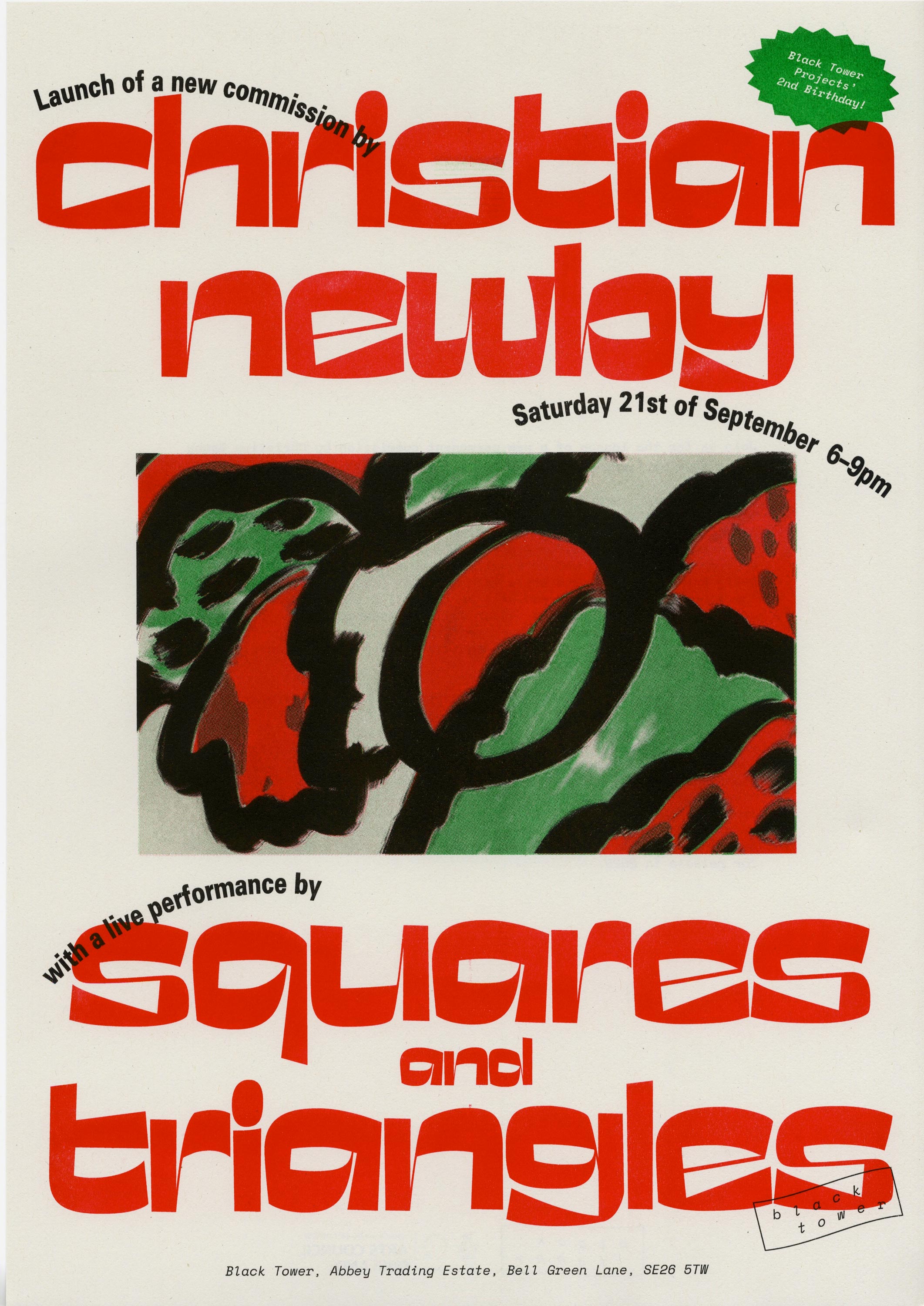 The launch of event for this commission features a live performance by Squares & Triangles, a musical collective of artists based across Copenhagen, Zurich and London. Over the past 10 years, they have developed a language of improvised song-making, drawing from the histories of jazz and improvised music, 1980s American punk and Scandinavian pop. Squares & Triangles will use Black Tower Projects as a rehearsal and recording studio in the days leading up to the event, exploring the relationship between textiles and musical composition, drawing upon techniques such as weaving, unravelling and tufting. Their public performance will be recorded and form part of a new release, scheduled 2020.