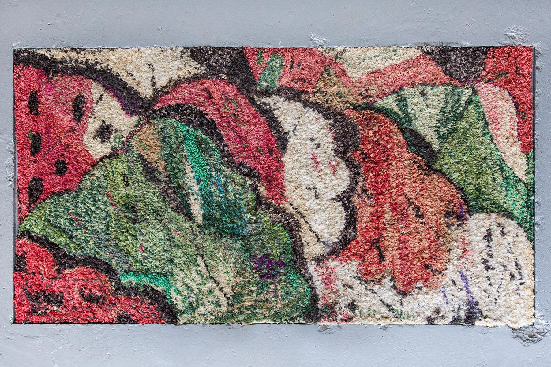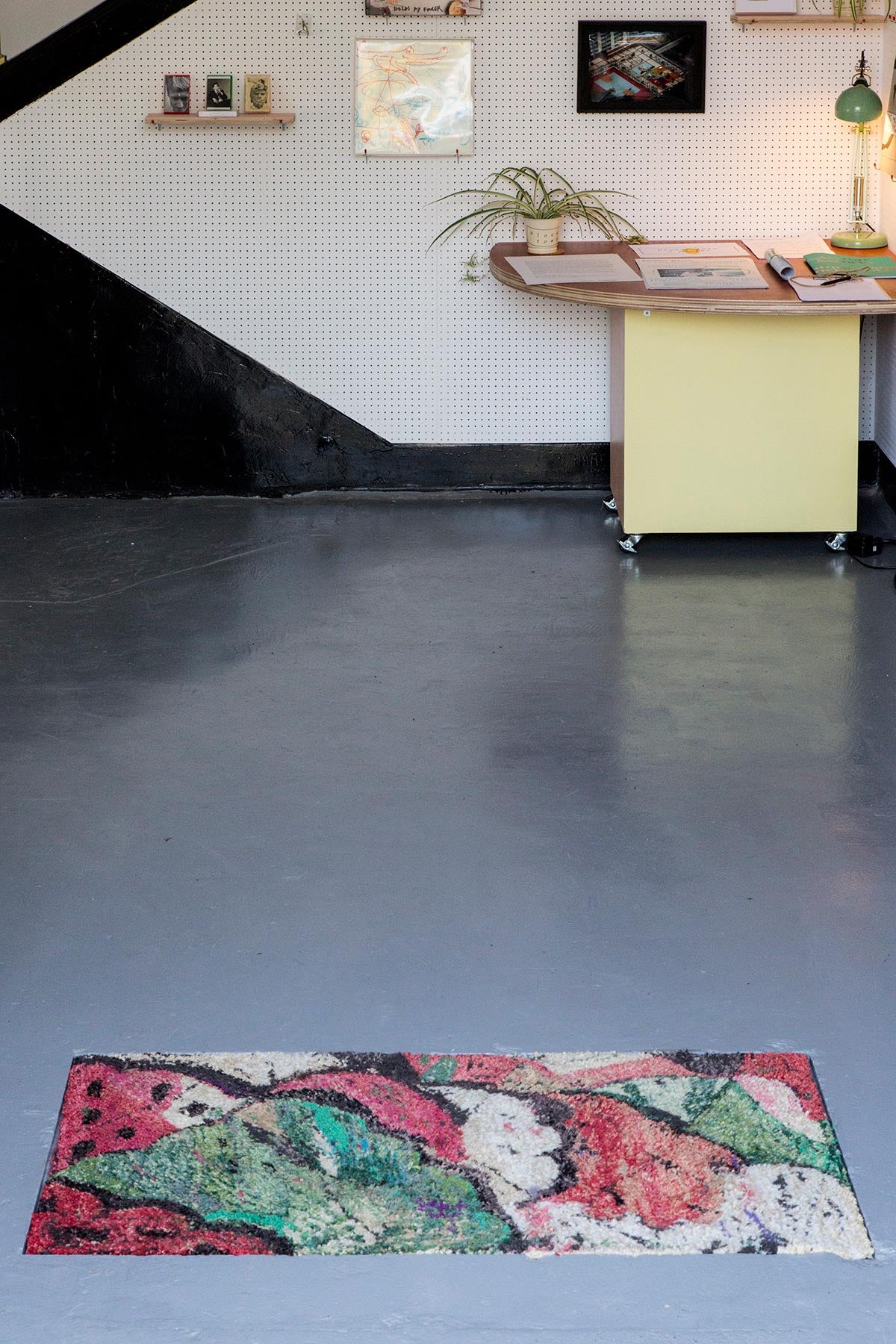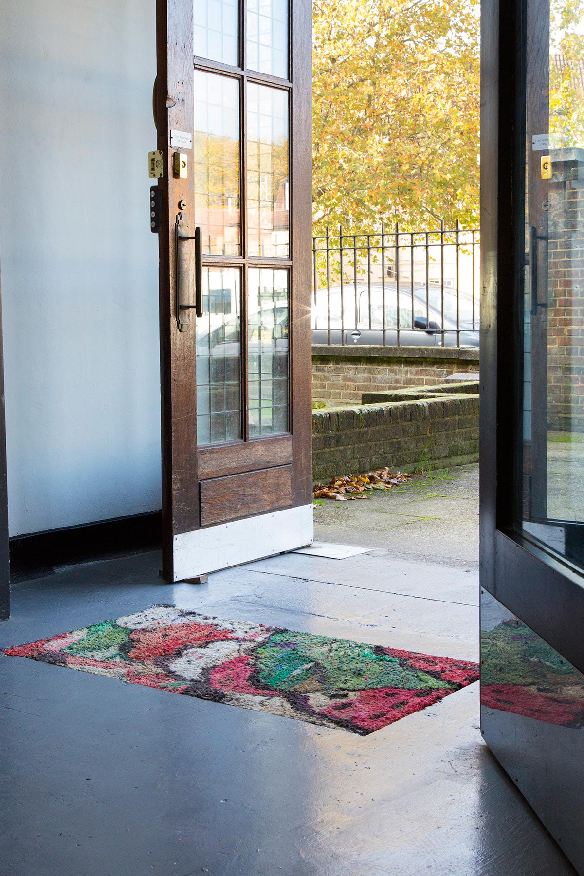 Christian Newby incorporates techniques of industrial textile production into an experimental drawing practice, challenging the design principles and craft rhetoric commonly associated with carpet tufting. Newby has produced a floor mat for Black Tower, created through a process of improvised drawing and mark-making using a handheld tufting gun. Puffy Red Black Green and White with Lozenges (2019) is located in the lobby of the building and will be the first artwork encountered by a visitor to Black Tower. As a floor mat, it encourages an informal relationship between artwork and spectator. The work sets the tone for the project space, implying a context for art to be engaged with directly, physically, informally.